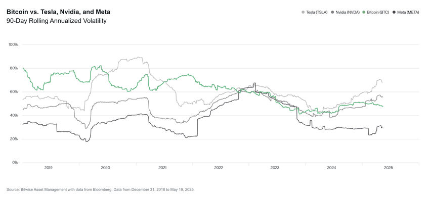 «Один особливо цікавий показник — це волатильність біткоїна порівняно з провідними технологічними акціями, такими як Tesla та Nvidia. Багато інвесторів кажуть: “Я ніколи не інвестував би в щось таке волатильне, як біткоїн,” — пояснив Райан Расмуссен, керівник відділу досліджень Bitwise, додавши: “Водночас більшість інвесторів володіють акціями Tesla та Nvidia (або безпосередньо, або через індексні фонди, такі як S&P 500 та Nasdaq-100). У останні місяці Tesla та Nvidia були більш волатильними, ніж біткоїн.”»