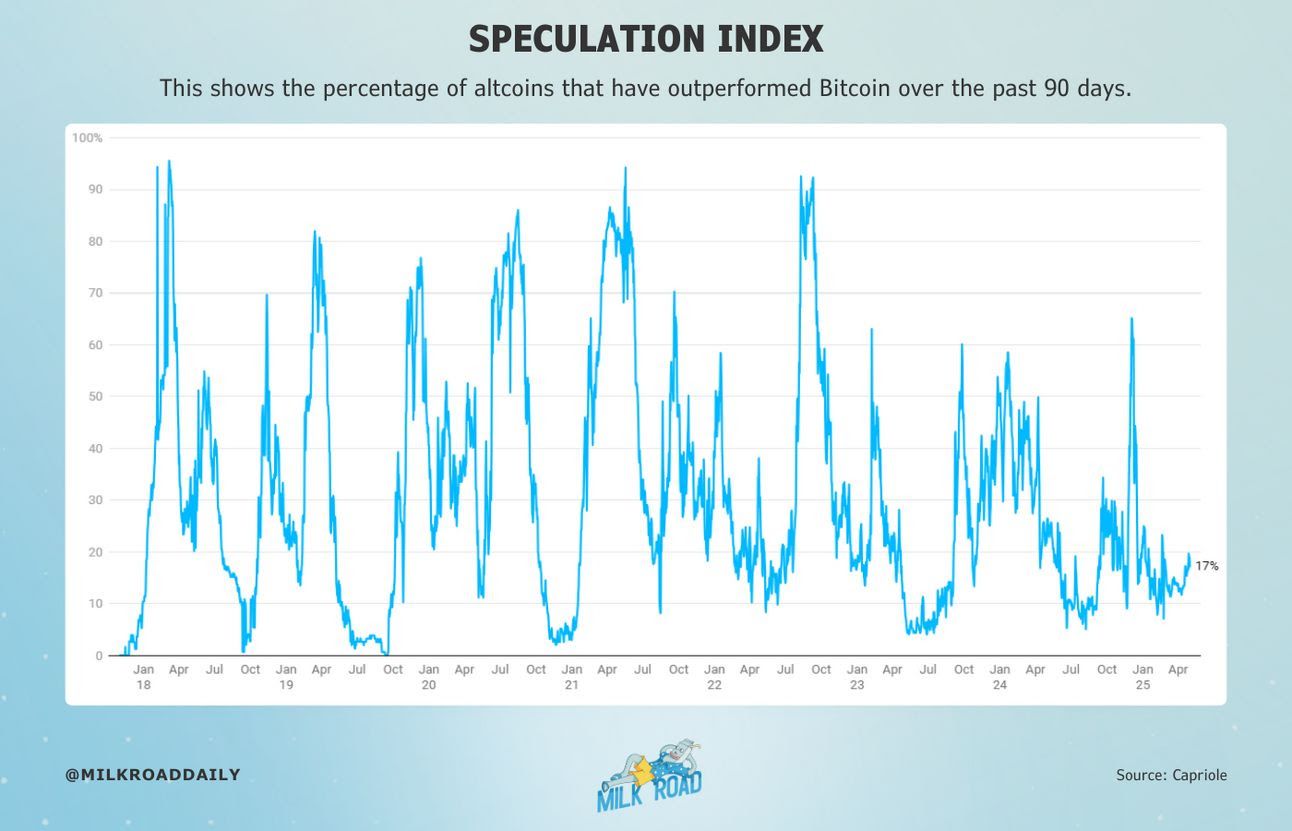 «Лише 17 % альткоїнів перевершили BTC за останні 90 днів. Це не ротація. Це домінування BTC тримає кермо. Поки цей показник не перевищить 70 %, сезон альткоїнів не на часі. Ще ні», — сказав Milk Road.